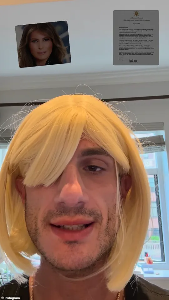 After reading the letter, Schlossberg broke character, dropping the accent and the wig to deliver a critical assessment of Melania’s message. ‘I don’t think it made any sense,’ he told his followers, questioning the letter’s substance and suggesting that Melania’s husband—President Trump—might be better suited to address the issue at hand.