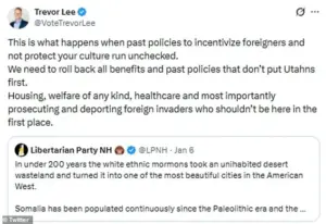 Lee himself responded to the allegations, calling the accusations of ‘bigotry and racism’ ‘completely unfounded and disappointing.’ In a statement to KSL, he emphasized that his comments had always focused on ‘policy—specifically, the need to enforce our nation’s immigration laws consistently, protect American culture and sovereignty, and ensure that progressive platforms (like those promoted by Mr.
