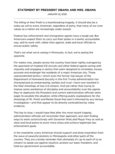 Former President Barack Obama has entered the fray of a deeply polarizing debate over the Trump administration’s handling of immigration enforcement, issuing a rare and pointed critique following the fatal shootings of two U.S. citizens in Minnesota.