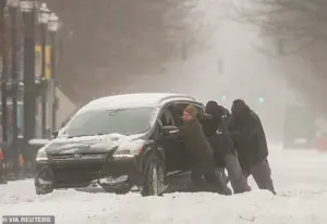 Americans throughout the country struggled to dig out after a massive storm walloped the US over the weekend. A group of men are pictured here trying to help a stuck motorist in the snow in Louisville, Kentucky