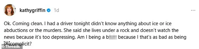 Griffin, currently on her ‘New Face, New Tour,’ described the encounter in a candid post that reads like a confession. ‘Ok. Coming clean. I had a driver tonight, didn’t know anything about ICE or ICE abductions or the murders,’ she wrote, referencing the deaths of Alex Pretti and Renee Good, who were fatally shot by federal officers in Minneapolis earlier this year. Her tone was sharp, questioning whether the driver’s avoidance of news was ‘as bad as being complicit.’ The post quickly drew attention, with one commenter suggesting Griffin ‘explained a few facts with grace.’ She responded with a sarcastic jab: ‘Oh yeah, I’m known for my grace.’