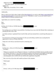 Epstein texted Woody Allen about David in August 2016, according to the files